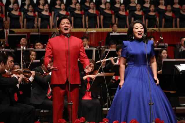 著名歌唱家莫华伦(左)和崔峥嵘(右)合唱歌曲《不忘初心》。