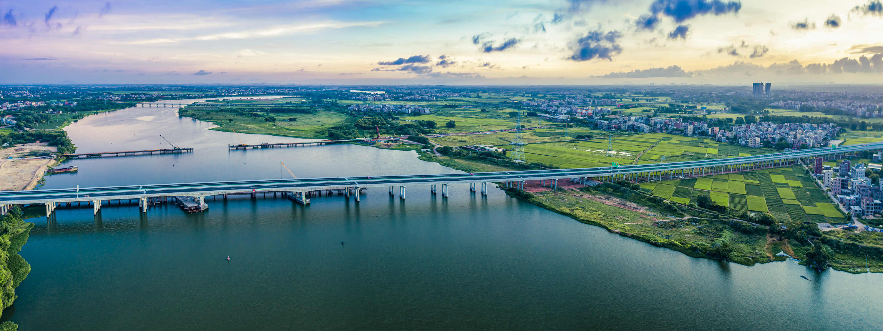 驱车进入吴川支线,高速公路与美丽乡村、翠绿林海、碧蓝江水交织互映。