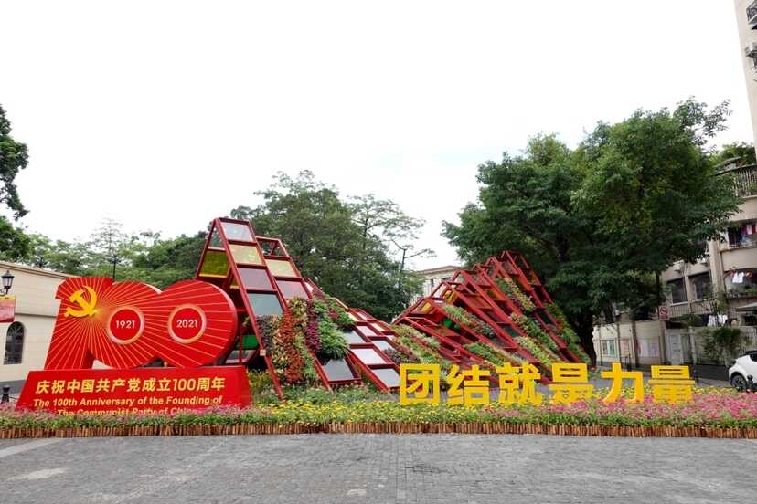 记者还从荔湾区获悉,区内主要道路、公园入口等节点设置一系列主题景观,以灿烂的繁花和绿雕营造深厚节日氛围。陈家祠广场外,以一篮荔枝为主体的大型立体花坛,周边搭配广州市花木棉花造景,形态生动惟妙惟肖,寓意着人民在党的领导下,人民战胜困难,安居乐业,生活水平节节高升。沙面岛上的“众志成城”立体花坛,展现了在抗疫工作中的医务工作者、公安干警、社区志愿者及党员突击队们舍生忘死、无私奉献、万众一心、砥砺前行的强大力量。洲头咀隧道、芳村大道、花地大道、芳村隧道口、康王路隧道、中山七路等区内主要道路上,也设置一系列红色主题景观。