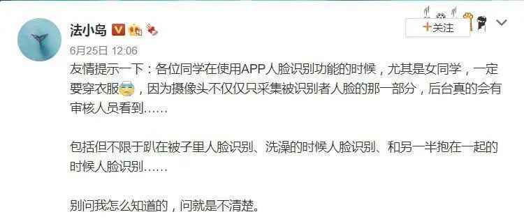近日,教育博主@法小岛发博称,大家在使用App人脸识别功能时一定要穿衣服,因为“摄像头不仅仅只采集被识别者人脸的一部分”。他表示,有从事后台审核的朋友对他说,在审核工作时经常会看到很多人在洗澡、和另一半抱在一起、没穿衣服等等各种“奇奇怪怪”动作的时候进行人脸识别。