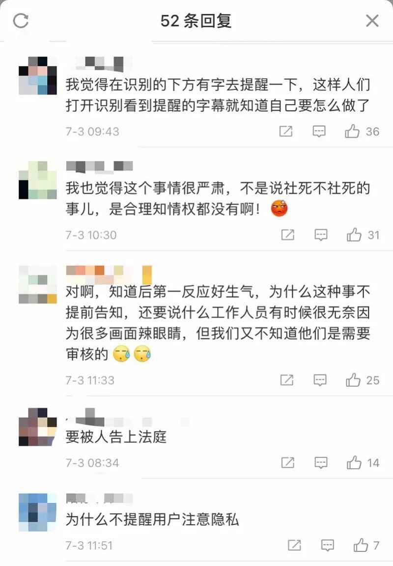 “这都属于侵权了,我们消费者的知情权呢?”除了感到“社死”外,不少网友认为这是一件“严肃的事情”,“感觉隐私被侵犯到”,甚至还有网友提出了相应的解决方案,认为可以“在识别的下方用字提醒一下人们”。