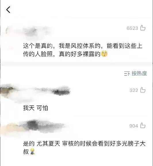 微博留言的两条高赞评论均对@法小岛 的说法表示认同,称自己是风控体系的,可以看到人们上传的人脸照,“真的好多裸露的”,“尤其夏天审核的时候会看到好多光膀子大叔”。