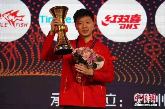 2020国际乒联总决赛,男单冠军马龙在颁奖仪式上捧杯。中新社记者 阚力 摄