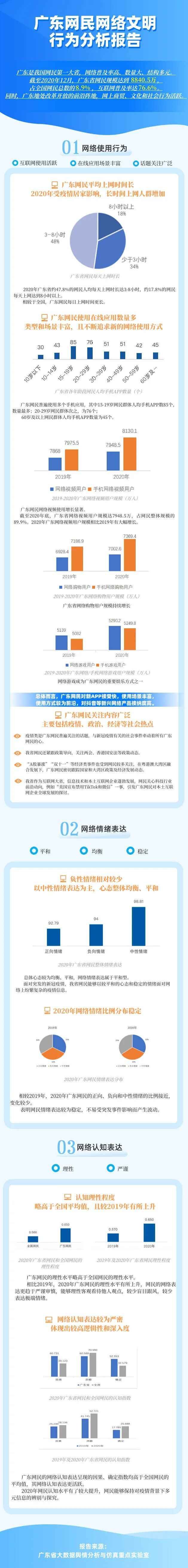 作为网络大省,广东网民的网络活跃度如何?广东网民上网时都在关注什么?广东网民的信息甄别能力是否达标?7月29日上午,“广东网民网络文明行为分析”报告在2021广东省网络文明宣传季活动启动仪式上正式发布,该报告由广东省大数据舆情分析与仿真重点实验室完成。报告显示,广东网民的网络使用特点包括互联网使用活跃、在线应用场景丰富、话题关注广泛等,在情绪表达上则负性情绪相对较少,以中性情绪表达为主,心态整体均衡、平和。