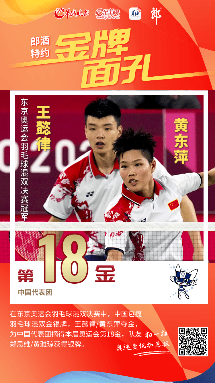 北京时间30日下午,在东京奥运会羽毛球混双项目决赛中,中国混双组合王懿律/黄东萍以2:1战胜队友郑思维/黄雅琼,摘得金牌。这是中国羽毛球队本届奥运会的第一枚金牌,也是中国代表团本届奥运会的第18金牌。祝贺中国健儿!