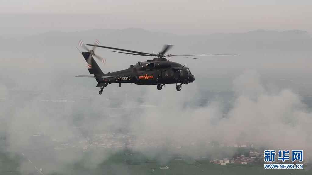 7月24日,陆军第83集团军某旅出动直-20直升机向河南省新乡市辉县洪州乡、峪河镇等地投送物资(手机拍摄)。新华社发(朱文海 摄)
