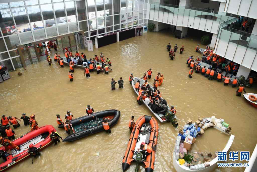 7月22日,在阜外华中心血管病医院门诊部,救援人员在积水的大厅内驾驶舟艇转移病患。新华社发(季鹏 摄)