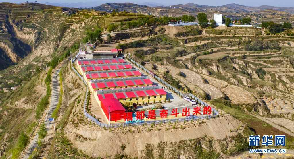 这是武警甘肃总队、天津总队为甘肃省广河县齐家镇魏家咀村援建的产业扶贫养殖基地(无人机照片,2018年10月11日摄)。新华社发(侯崇慧 摄)