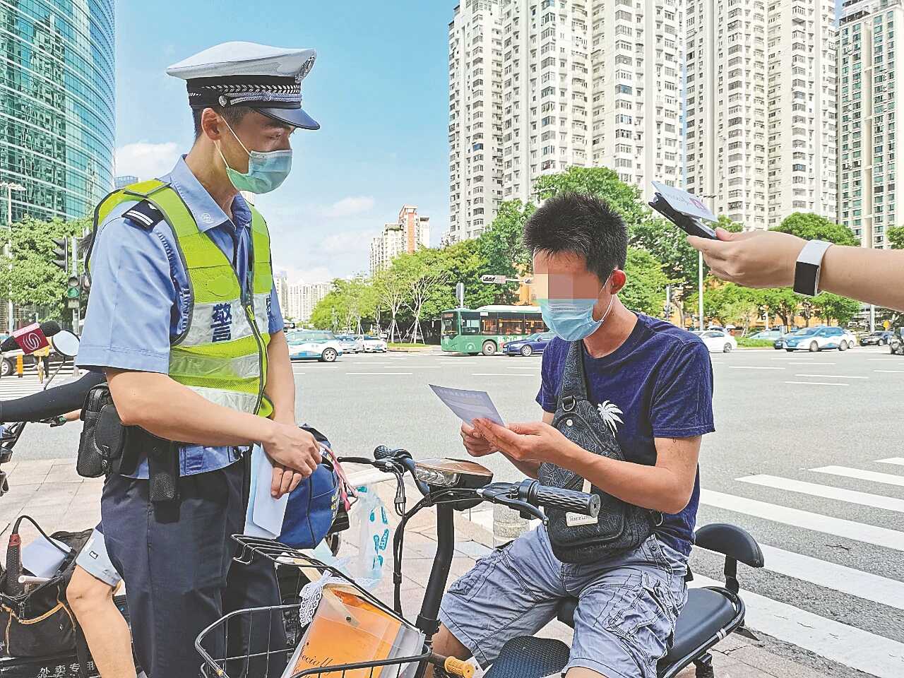 8月1日,深圳一男子骑电动车未按规定戴头盔被交警拦下教育