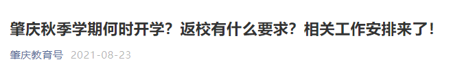 8月23日,肇庆市校园疫情防控工作专班制定《2021年秋季学期开学工作方案》,明确具备开学条件的中小学校、特殊教育学校、幼儿园开学时间为9月1日(高三年级为8月1日)。在肇高校、技工院校、中职学校具备校园疫情防控条件的学校,可组织学生分期、分批、错峰、有序返校。各校具体开学返校时间及工作方案,由学校结合实际研究制定。
