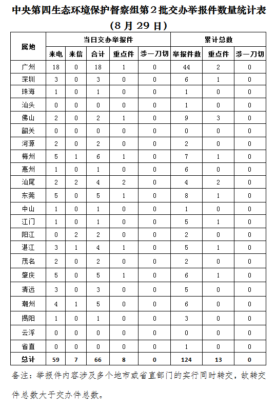 8月29日,中央第四生态环境保护督察组交办第2批涉及环境领域群众举报件65件(来电58件,来信7件),列为重点关注件8件(汕尾2件、广州1件、佛山1件、梅州1件、东莞1件、湛江1件、肇庆1件)。