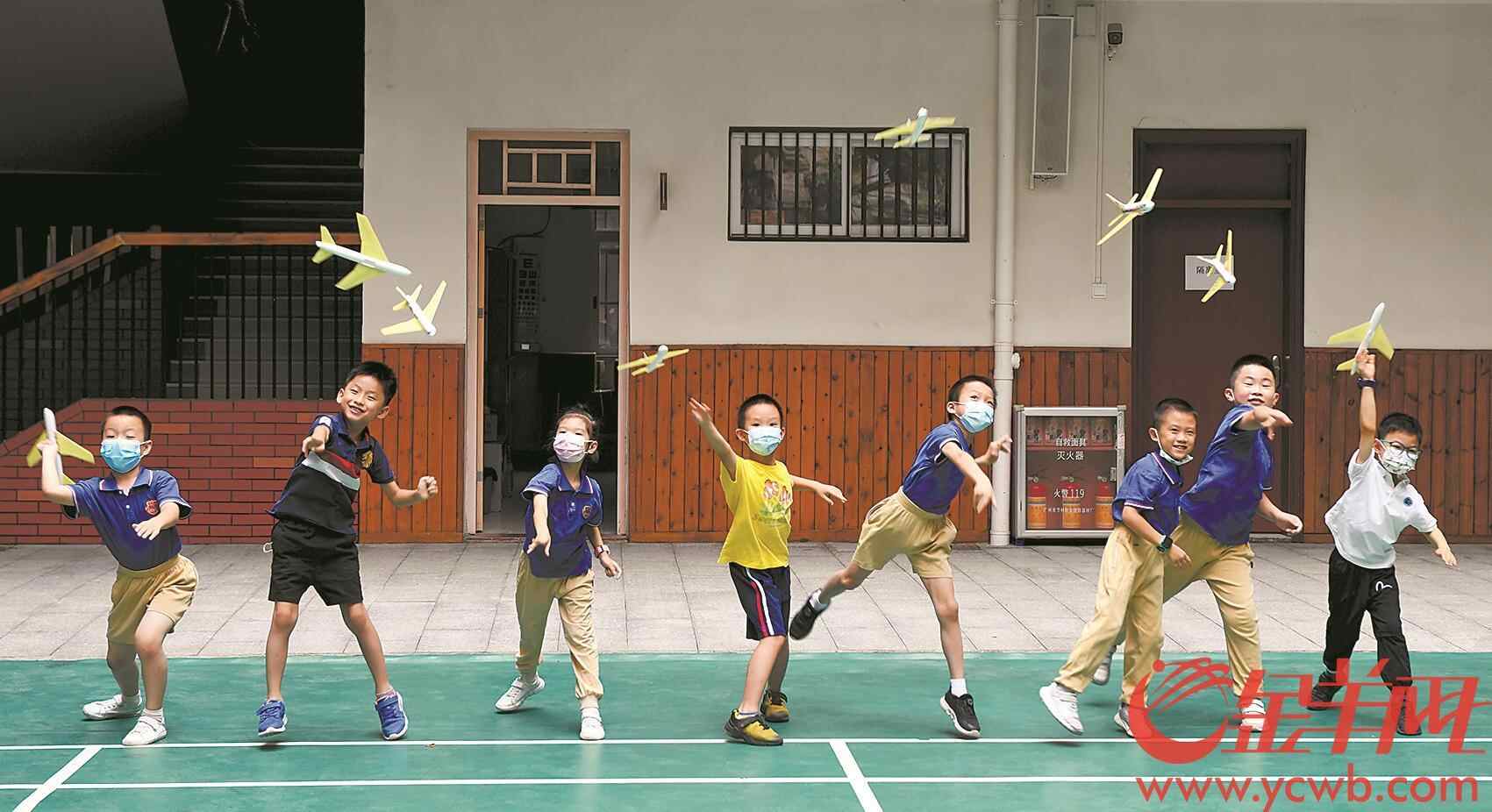 小北路小学(天香校区)暑期托管班,学生们在操场上放飞自制的飞机模型 羊城晚报全媒体记者 林桂炎 摄