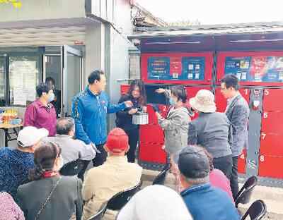 工作人员在北京市东城区景山街道给居民讲解电动车智能充电柜使用方法。(景山街道供图)