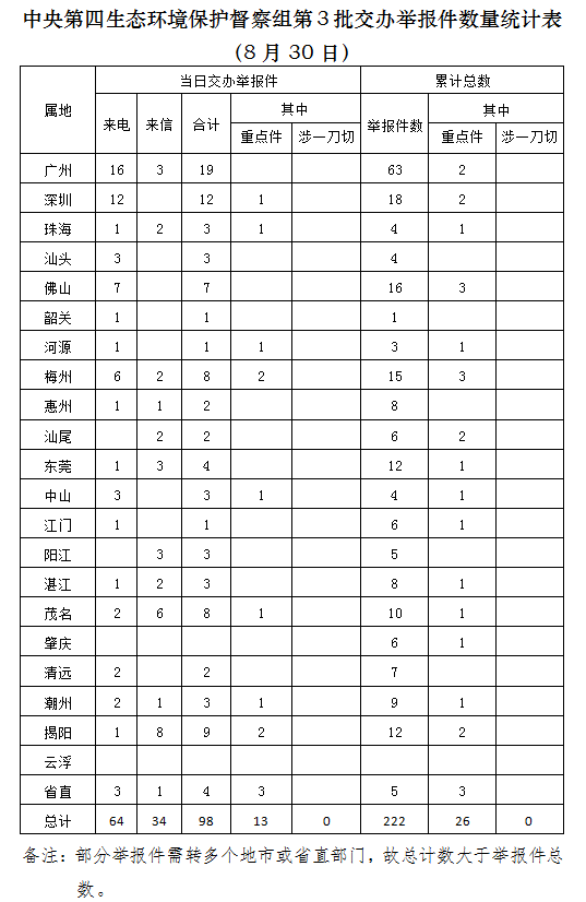 8月30日,中央第四生态环境保护督察组交办第3批涉及环境领域群众举报案件91件(来电57件,来信34件),其中列为重点关注案件9件(梅州2件、揭阳2件、深圳1件、珠海1件、河源1件、涉中山与茂名两地1件、潮州1件)。