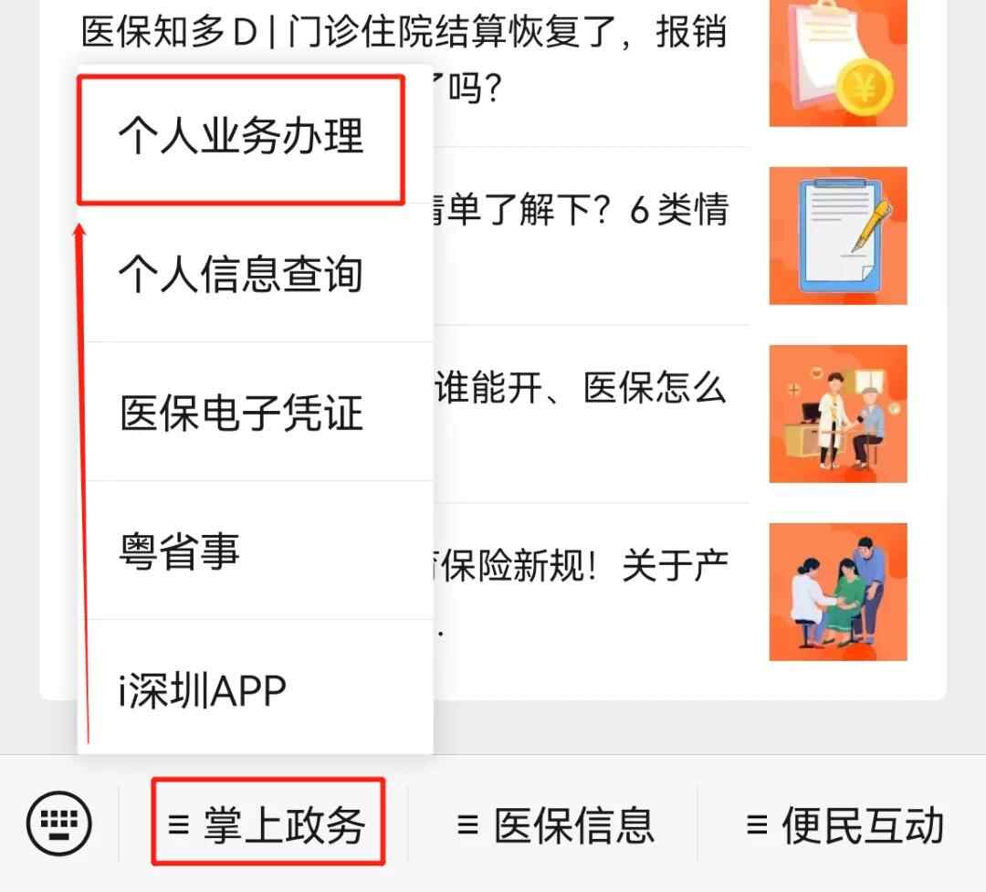 微信绑定:关注“深圳医保”微信公众号,选择“掌上政务”→“个人业务办理”办理绑定。