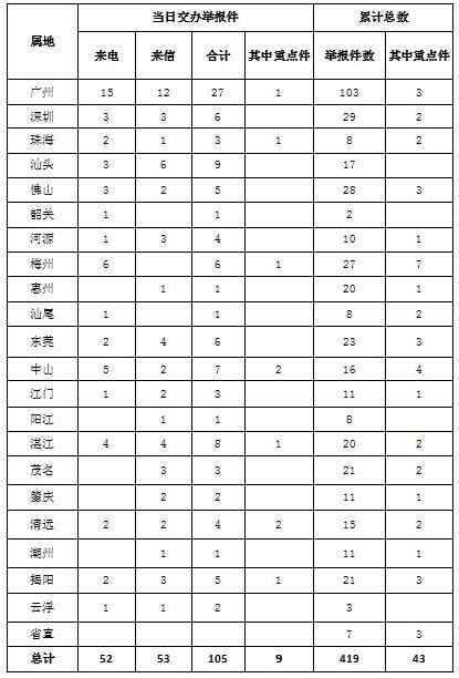 金羊网讯 9月1日,中央第四生态环境保护督察组向广东交办第5批涉及环境领域群众举报案件103件(来电52件,来信51件),其中列为重点关注案件9件(中山2件,清远2件,广州1件,珠海1件,梅州1件,湛江1件,揭阳1件)。