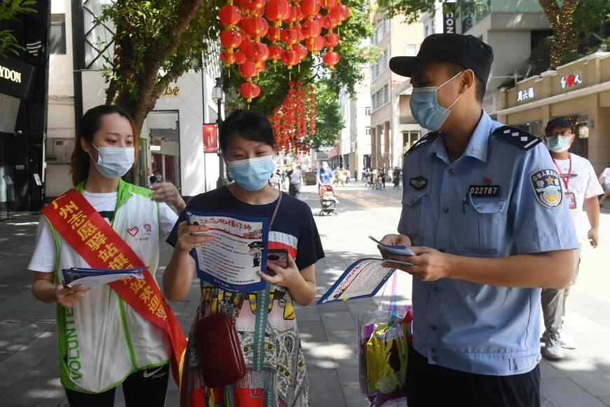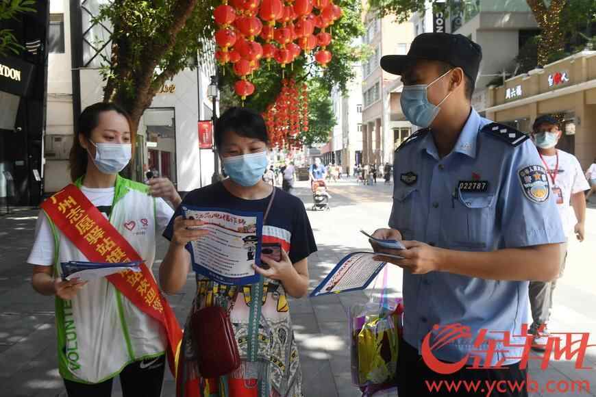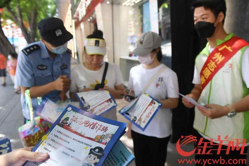 当天,在北京路步行街上,有不少身穿志愿者马甲、手拿反诈宣传单张的青年志愿者。他们走进商铺、走上步行街,向往来的市民和商户们宣讲防诈骗知识,推广注册“广州反诈”公众号、“穗安防诈”小程序。