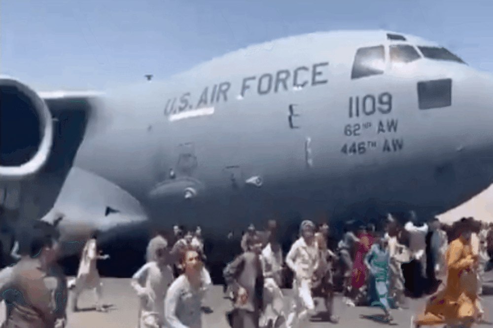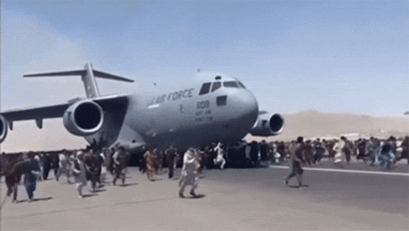 ▲2021年,“他们一无所有,但他们获得了自由”:数千名阿富汗人涌入喀布尔卡尔扎伊国际机场跑道,试图追逐并登上正要起飞的美军C-17运输机。