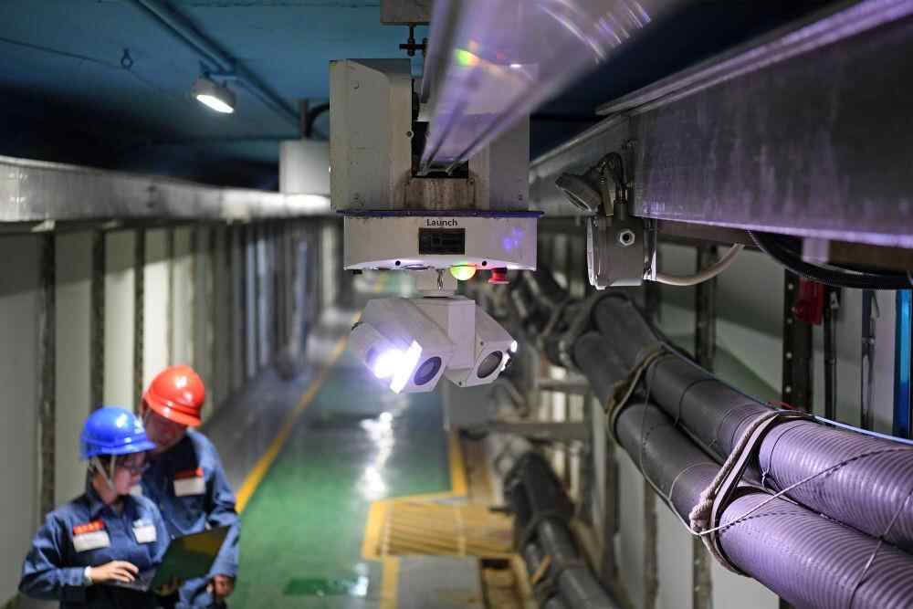在珠海横琴综合管廊电力隧道里,南方电网工作人员操作巡检机器人对电缆隧道动态巡检(2019年12月12日摄)。新华社记者 梁旭 摄