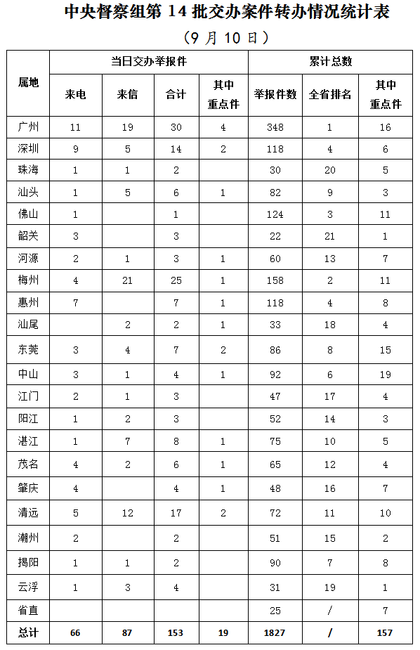 9月10日,中央第四生态环境保护督察组向广东交办第14批涉及环境领域群众举报案件153件(来电66件,来信87件),其中列为重点关注案件19件(广州4件,深圳、东莞、清远各2件,汕头、河源、梅州、惠州、汕尾、中山、湛江、茂名、肇庆各1件)。