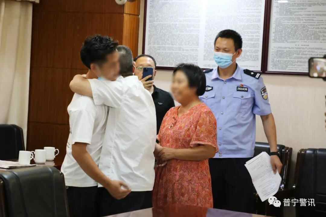 在普宁市公安局举行的“团圆行动”认亲仪式上,时隔23年,26岁的蔡某涛与自己的亲生父母和姐妹相认,一家人终于团聚。从东莞赶来的父亲罗某洋十分激动,双手颤抖地一把抱住日思夜想的儿子,哽咽不已。