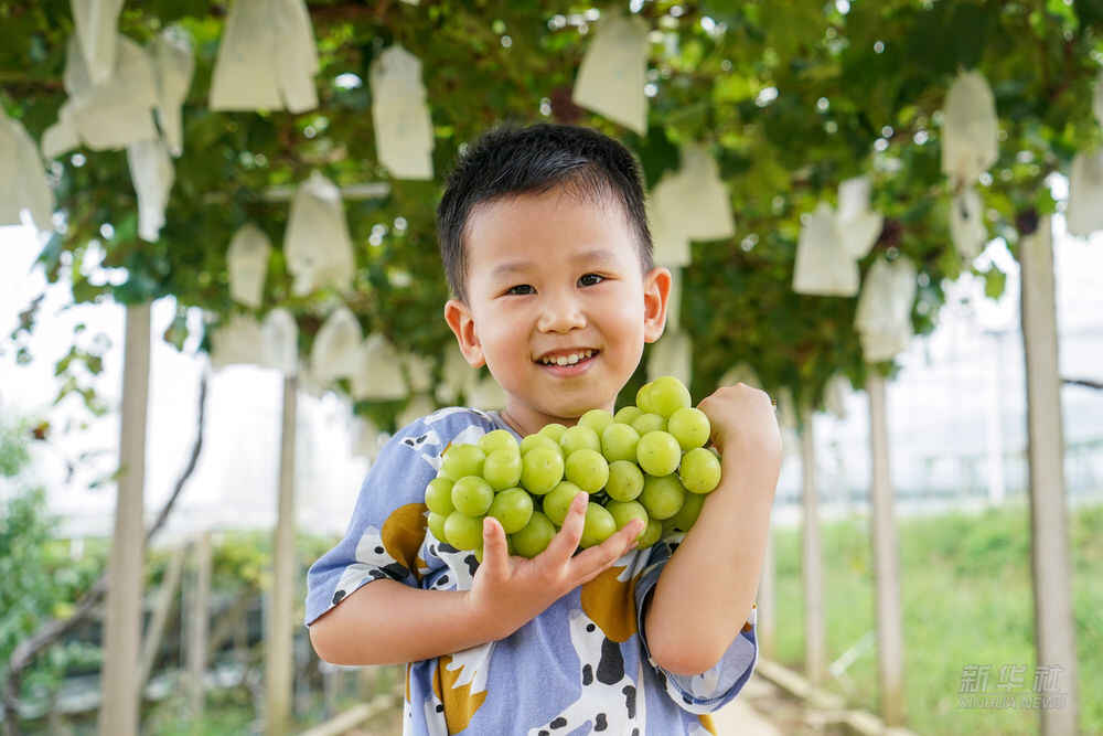 △在江苏省句容市丁庄村二丫葡萄专业合作社,小朋友展示刚采摘的葡萄(2021年8月29日摄)。