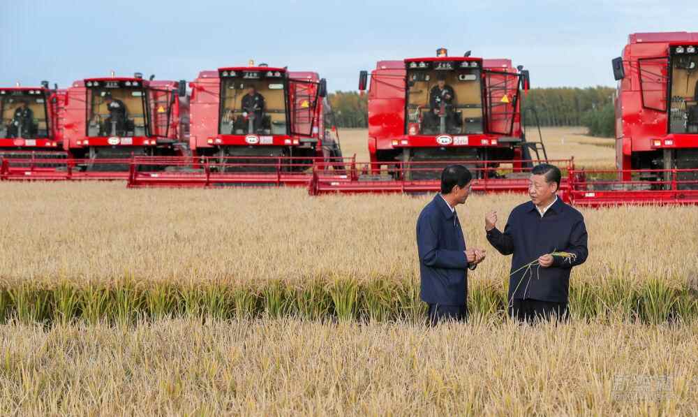△2018年9月25日至28日,习近平在东北三省考察,主持召开深入推进东北振兴座谈会。这是25日下午,习近平在黑龙江农垦建三江管理局七星农场万亩大地号了解粮食生产和收获情况。