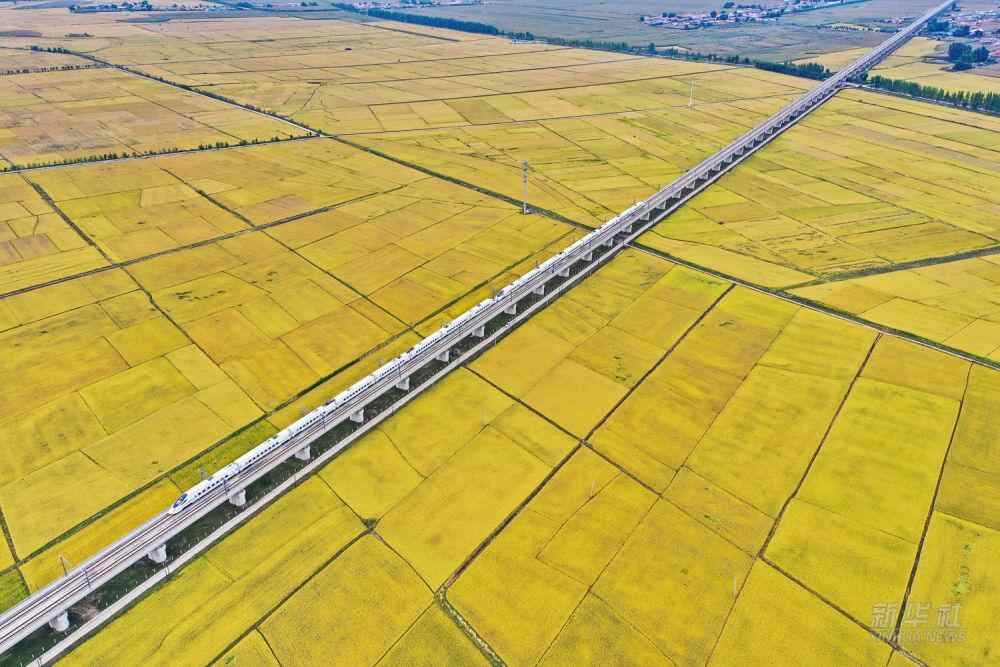△高铁驶过吉林省公主岭市一片沃野(2021年9月19日摄,无人机照片)。