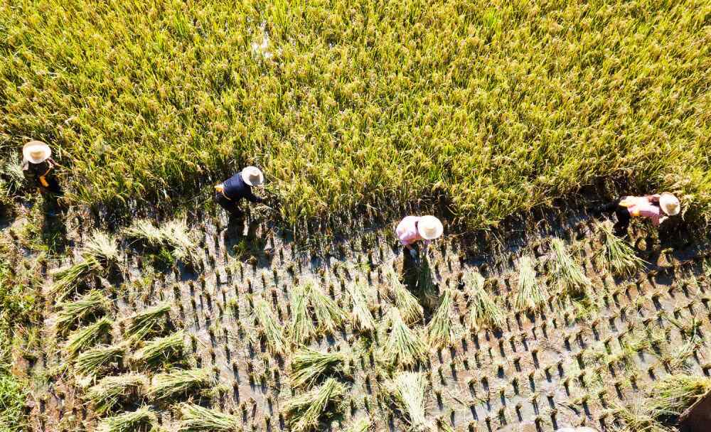 △陕西省安康市平利县西河镇女娲山村村民们在水田里收割水稻(2021年9月20日摄,无人机照片)。