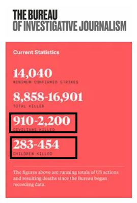 据总部位于英国伦敦的“新闻调查社”统计,从2004年2月到2020年2月,美国在阿富汗、巴基斯坦、索马里和也门的无人机空袭造成910名至2200名平民死亡,其中包括283至454名儿童。