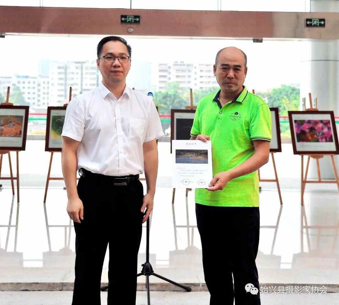 始兴县委常委胡长江(右一)、副县长张智光(左一)向二等奖获奖者颁奖,二等奖获奖者没到颁奖现场的由始兴县摄影家协会会员代领。