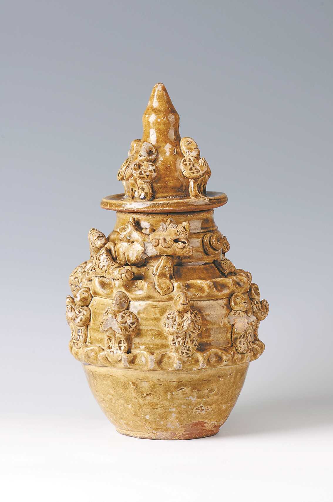该见器物瓷质,通身施青黄釉。器盖宝珠钮,三层宝塔状盖,子母口,器身直口,平沿,弧腹,下腹斜收,平底内凹,盖底及瓶底无釉处呈紫红色。盖面贴塑双手合掌人像四个。颈台阶式两层,下层贴鼓钉,颈肩处贴双系。腹部贴波折形堆纹两层,其上堆塑盘龙及双手合掌人像。
