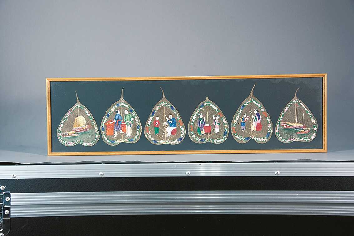 一组6幅,以菩提叶为材料,水彩绘制船舶、市井人物、乐手演奏图。该组菩提叶中的人物描绘生动,神态自若,船舶描绘细腻,方寸之间的画面色彩明暗处理得当,富有立体感。菩提叶是除通草纸外,一种成本相对低廉的材料,在清代广州外销画中占据着一席之地。