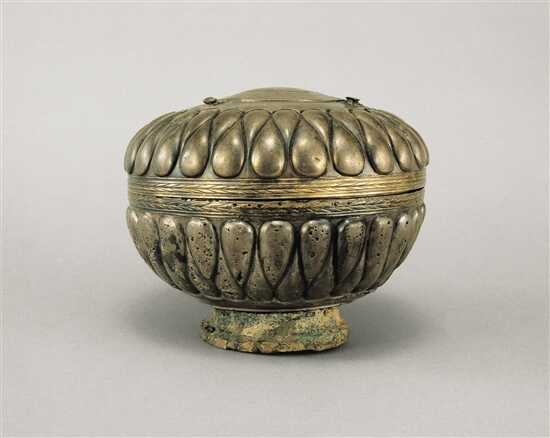 凸瓣纹银盒呈扁球形,盖与盒身上采用锤鍱工艺制成对向交错的蒜头形凸纹。这种工艺与纹饰、造型带有古代西亚波斯银器的特点,与中国本土不同。专家认为这是一件海外舶来品,说明广州是中国古代海上丝绸之路的发祥地。这件银盒传入中国后,在器盖和底部又加上了汉字铭文,还按照汉代盒子的造型,在盖面加钮饰,底部接上铜圈足,这无论在当时或今天都可视为典型的“洋为中用”之物。