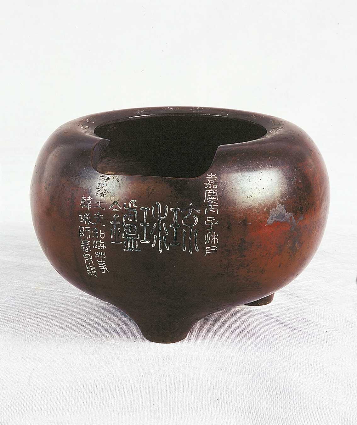 这件器物质地为紫铜,呈圆形,敛口有缺,鼓腹,三只袋状矮足。缺口下方正中刻有“琉球炉”三个较大的篆字,左右两边分别刻有“朝议大夫知海州事,韩城师亮采题”和“嘉庆丙子秋月”两组竖行篆字,另有“嘉庆丙子夏,琉球国八品巡见官毛朝玉因供奉宿城山法起寺,并系铭”等71字隶书记述了此炉的来历。此外,还有“三品金,一瓣香,航海来兮波不扬”的篆字题刻。