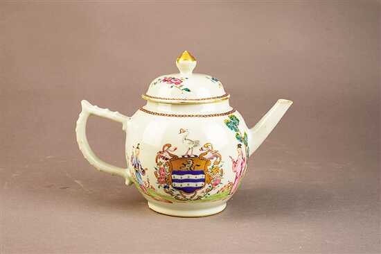 这件茶壶为广彩瓷器,壶身上绘有人物和徽章纹,此类纹样多为欧洲家族、军团、公司机构、城镇以及名人徽章。这种定制的徽章瓷器深受西方贵族喜爱。