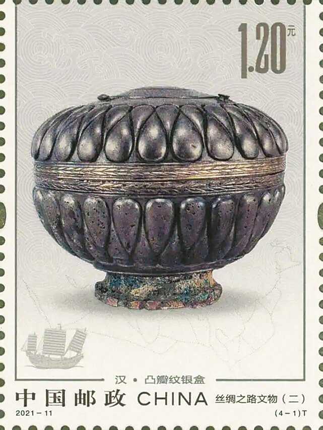 6月12日是2021年的“文化和自然遗产日”,中国邮政集团公司于当天正式发行《丝绸之路文物(二)》特种邮票一套4枚,其中一枚邮票图案便是来自南越王博物院的凸瓣纹银盒。2000多年前,银盒等一批舶来品漂洋过海来到广州,2000多年后,它们化身邮票主题图案,承载着厚重的文化内涵,焕发出新的生机与活力。