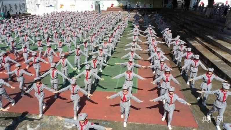 学生身着红军服跳韵律操。(央广网记者官文清摄)