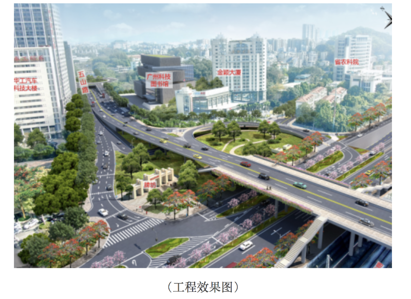 五山路与广园路立交工程是广州科技图书馆对外联系的重要交通节点,同时将优化区域路网结构,提高中心城区北部路网交通转换效率。配合广州科技图书馆的建设,提高图书馆的社会影响力,改善周边居民的出行、居住环境,对贯彻城市总体规划的发展目标具有积极推动作用。