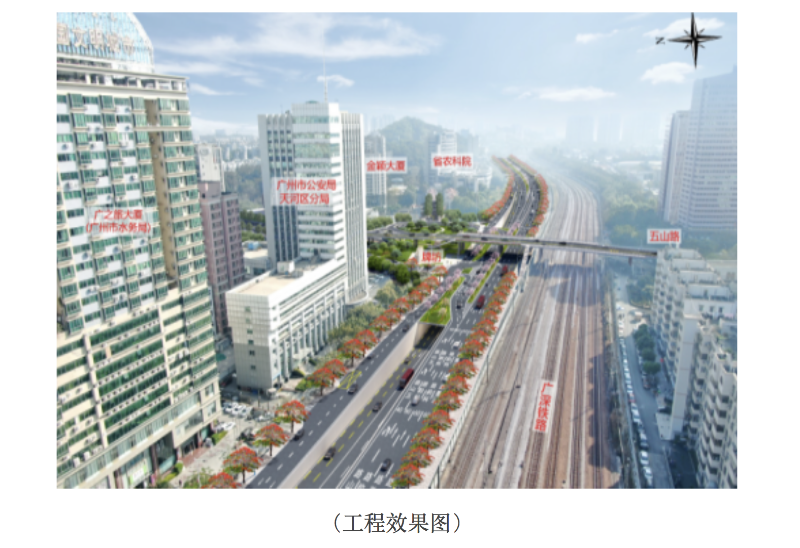 广园路改造长度约1.3千米,采用城市快速路技术标准建设,其中隧道长约678米,单向四车道,标准段横断面宽15.2米,设计速度60千米/小时;五山路改造长度约0.5千米,采用城市次干路技术标准建设,设计速度为40千米/小时。沿线同步改造照明、交通、绿化等设施。
