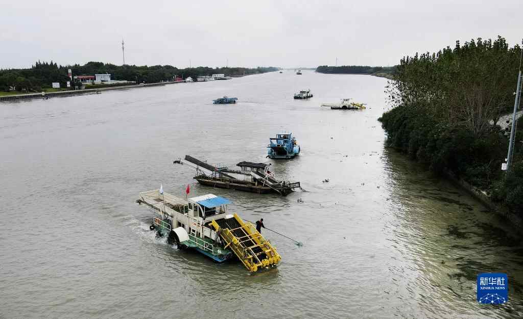 2020年10月15日,苏浙沪三地的保洁船在太浦河水域联合清理水面浮游植物(无人机照片)。新华社记者 方喆 摄