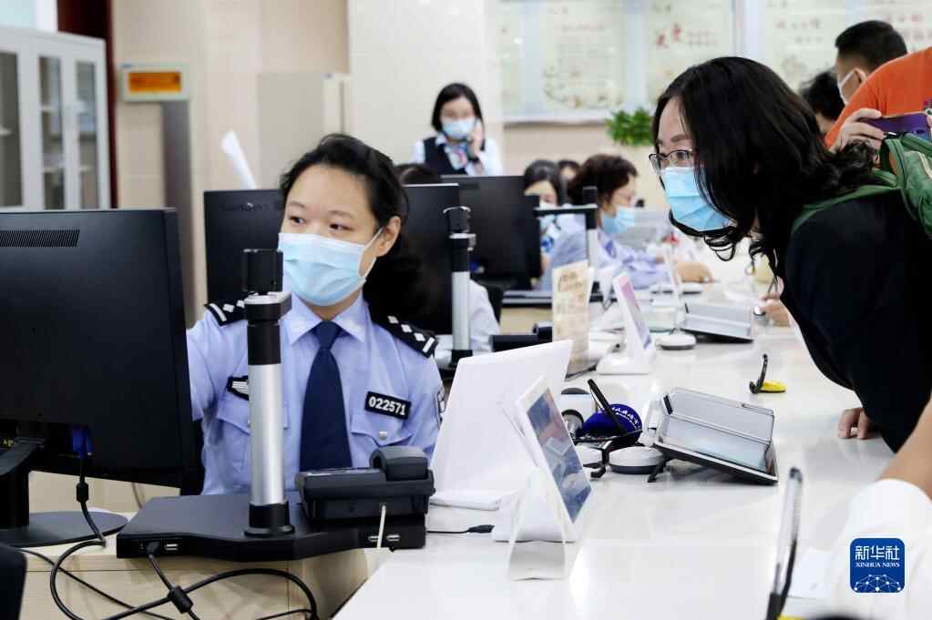 2020年10月14日,原籍浙江湖州的王秀丽(右)在上海市徐汇漕河泾社区事务受理服务中心公安综合窗口办理户口迁移手续,成为享受上海市公安局会同浙江省公安厅共同推出的沪浙“跨省市户口网上迁移”便民措施的第一人。新华社记者 方喆 摄