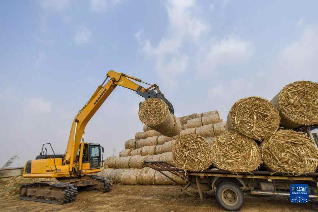 2020年11月12日,在吉林省四平市福港秸秆收储有限公司,农业机械搬运打包好的秸秆。新华社记者 张楠 摄