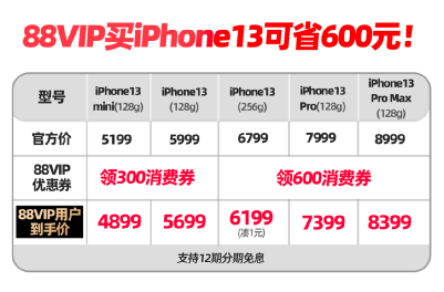 10月20日开始预售以来,消费者在种草机、商家直播间、各大攻略文档里疯狂“抄作业”。iPhone13或将成为今晚购物车里最抢手的商品。虽然新品发布才一个多月,但iPhone 13全系列就已经可以使用88VIP消费券,最高省600元!