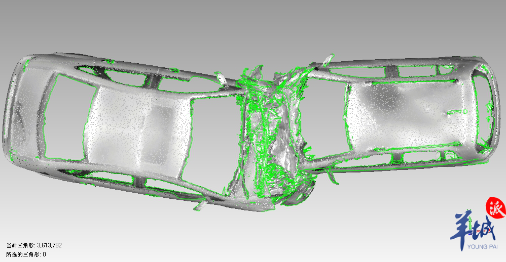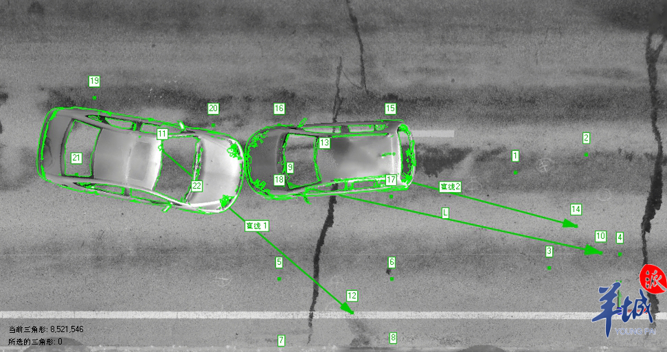 团队祭出了神器——激光三维扫描仪,再结合当时的现场照片,基本还原了事故发生时的痕迹。根据福克斯车当时的状态,即副车架左后角着地,形成一条斜向刮地痕,推断出该刮地痕为两辆车的第一碰撞点位置。再扫描比对两辆车事故前后的车况,三维还原变形情况,找到相应的变形位置,以此找到两辆车对应的碰撞点,还原当时两辆车的碰撞形态及碰撞角度。