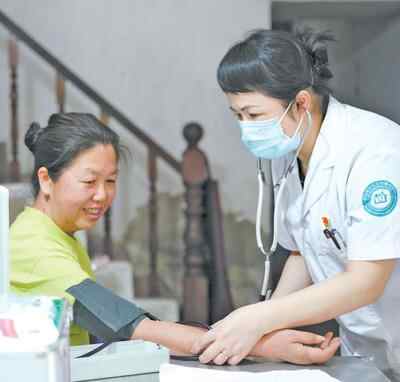 在浙江省台州市椒江区洪家社区一名慢性病患者家里,社区卫生服务中心蔡海红医生正在为患者开展上门随访服务。 张守华摄