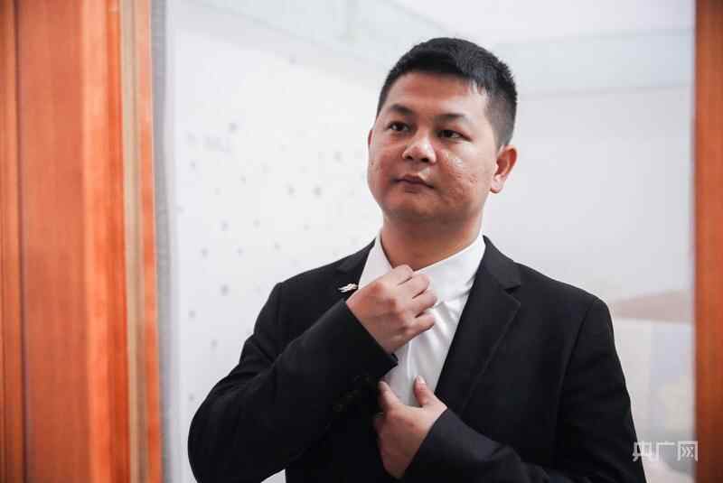 何冰辉正在整理着装。(央广网记者 官文清摄)