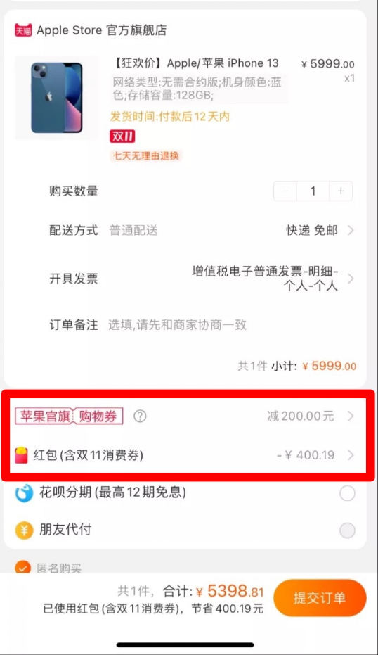 11月11日中午,消费者发现在天猫购买iPhone有了新价。在天猫Apple Store官方旗舰店下单128G的iPhone13时,原价5999元减去88VIP的400元消费券,确认订单页面显示再减200元。这相当于直减600元,到手价仅需5399元。