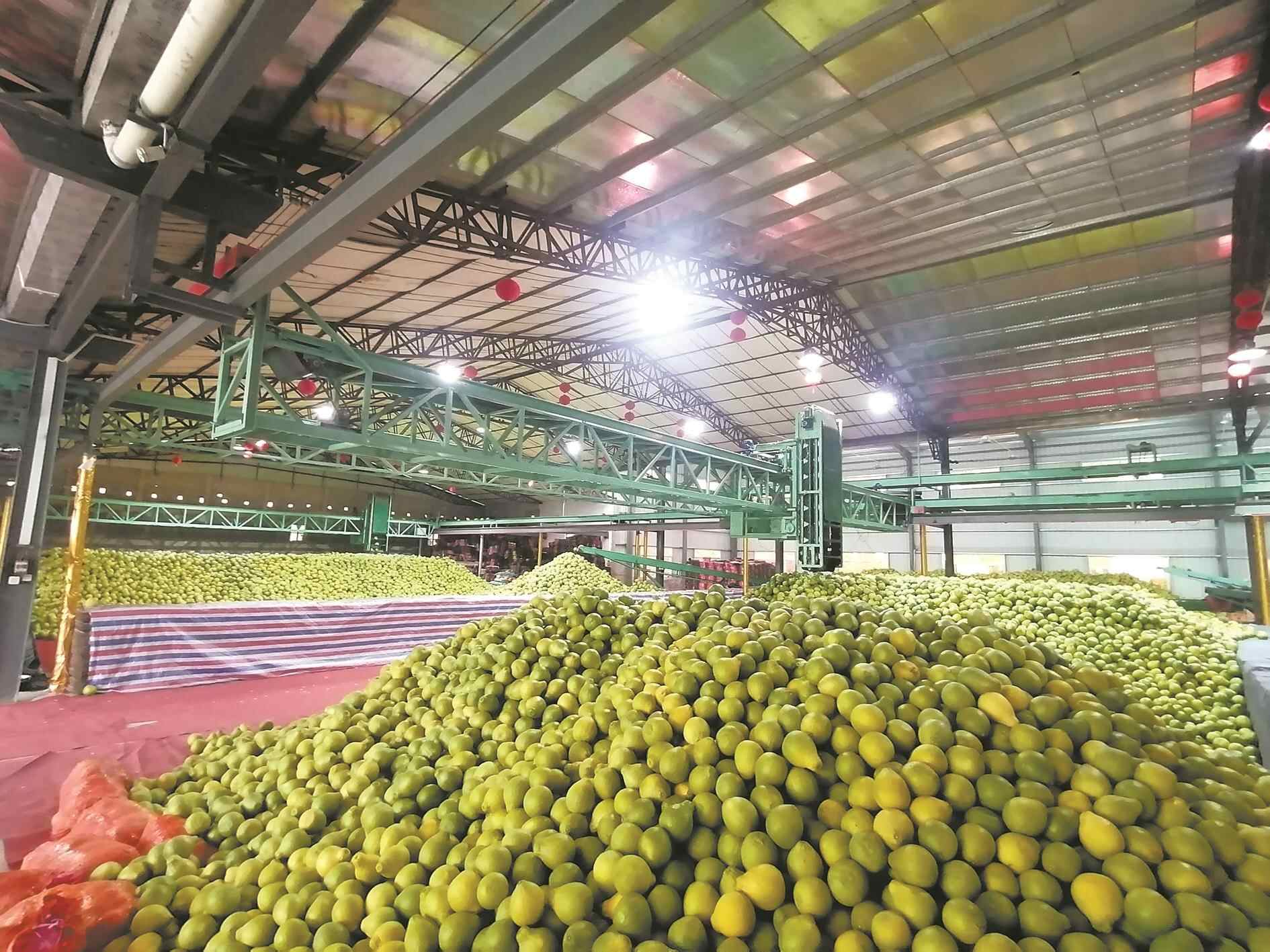 梅州市兴缘农业发展有限公司仓储基地柚子堆成了小山