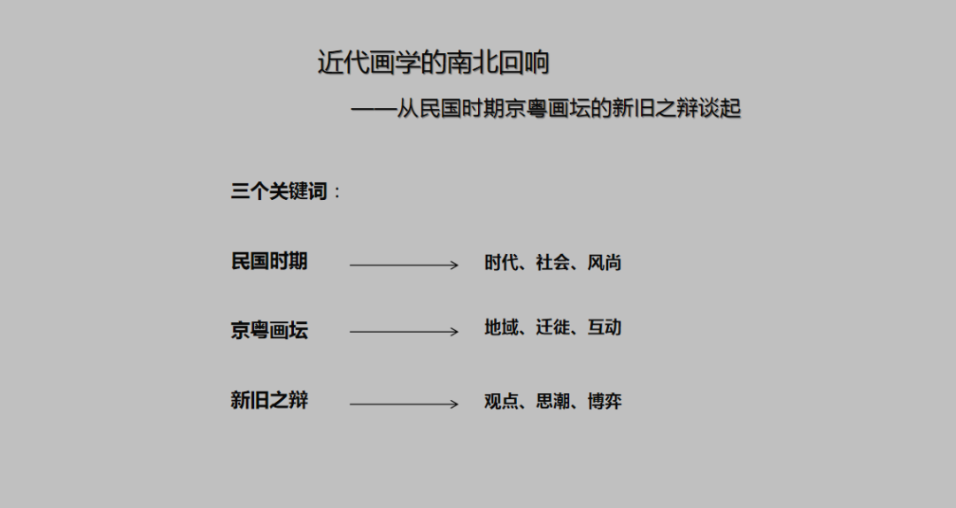 京粤画坛,一南一北,在一百年前,由北京、上海、广东地区共同构成了三足鼎立的主要板块,形成百年中国美术最重要的格局。最初京粤画坛在文化性格上有流派渊源上的南北问题。这个南北到了20世纪以后,一些地域性、特定性的问题伴随着种地域板块的联动,变得越来越紧密。新旧之辩,新旧的问题是相对性的问题。观点的新和旧,思潮的引领性和沉淀下来的经典性问题,包括新与旧在近百年来的剧烈博弈和互相之间的影响互渗的一个过程。“新旧之辩”的问题又是常变常新的问题。“中国画”“国画”“画学”和“美术”概念的语境转换问题。在二十世纪初期,当“艺术”或者“美术”词汇还未在中国画坛普遍流行时候,传统中国画在传统文化结构占有极为重要的一元地位。有这样语境,再来看民国时期关于中国画的讨论,就看到讨论变成非常开阔的画学语境,这个画学语境进来了西方的参照。西方参照成为中国画创新的最大动力来源,由此带来了传统的危机,现象的背后是文化自信力的逐渐削弱。西方参照模式给中国画带来的巨大的参照性和自觉自省的契机,使得我们对原有意义上一元论的“国画”“画学”“中国画”概念,有了不同于以往的观照、反思、自我批判。这是一个在整个大的宏观的思想上,中国画遇到前所未有的文化自信的问题。南和北在这个期间得到了深入的交融,各个地域板块边缘的模糊性、相对流动性,不同文化集群的影响,在这个时间不断蔓延、弥漫。不同地域画家的寓居现象,在这个时期成为了非常典型、常见的现象,“寓京”“寓沪”“寓粤”现象在民国时期屡见不鲜。
